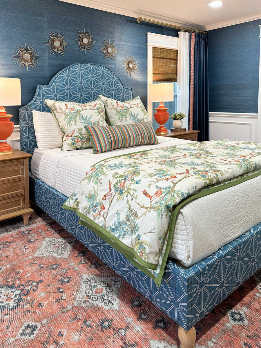 The sunburst mirrors over the headboard are from Hobby Lobby. I found the lamps on Facebook Marketplace and gave those a makeover. I built and upholstered the headboard (instructions here), and I built and upholstered the bed base (instructions here). For the bed, I used this fabric from Spoonflower (affiliate link). My mom made the large pillows for me, and I made the duvet cover (instructions here). For those, I used this fabric from Ballard Designs (affiliate link). The cream quilt and matching pillowcases are from Amazon (affiliate link).