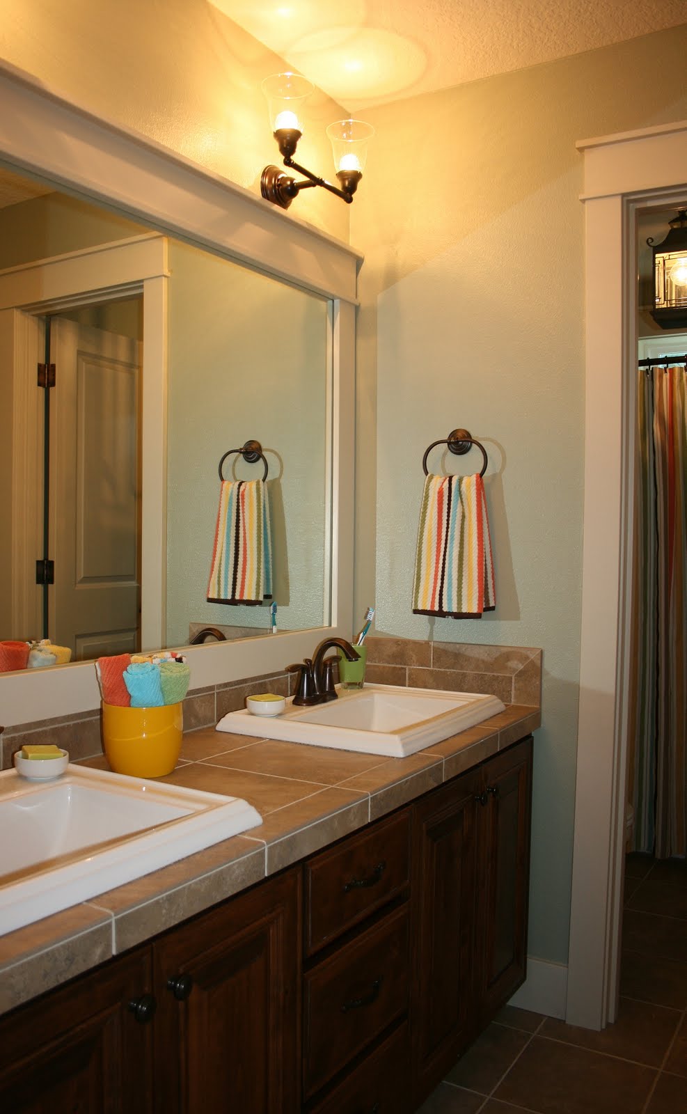 I plan on changing the mirror out in our powder room as soon as I find something I like. I am a bit stuck on our MB though. The large mirror we have now spans across 2 sinks separated by a vanity area. I kind of like have the full mirror in that room. Maybe I should just do a frame around the whole thing. hmmm