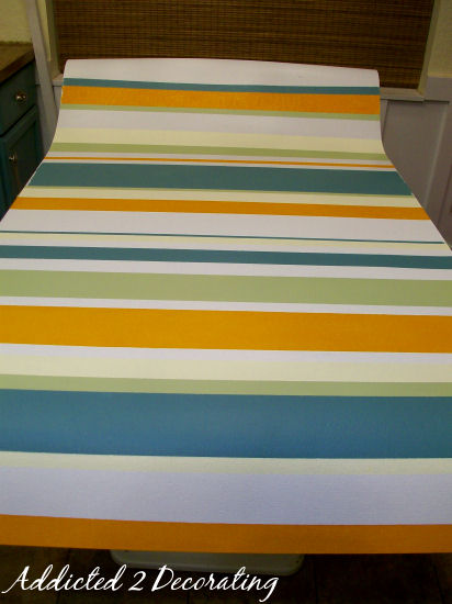 I still have a long way to go on it. Right now, I have only used the five main colors (the white from the ceiling and trim, the blue-green from the cabinets, the green from the chandelier and tree mural, the yellow from the walls, and the orange from the tree mural and painted family name sign). Some of those main stripes still need another coat. Then I have a few additional colors that I’m going to throw into the mix with some small stripes.