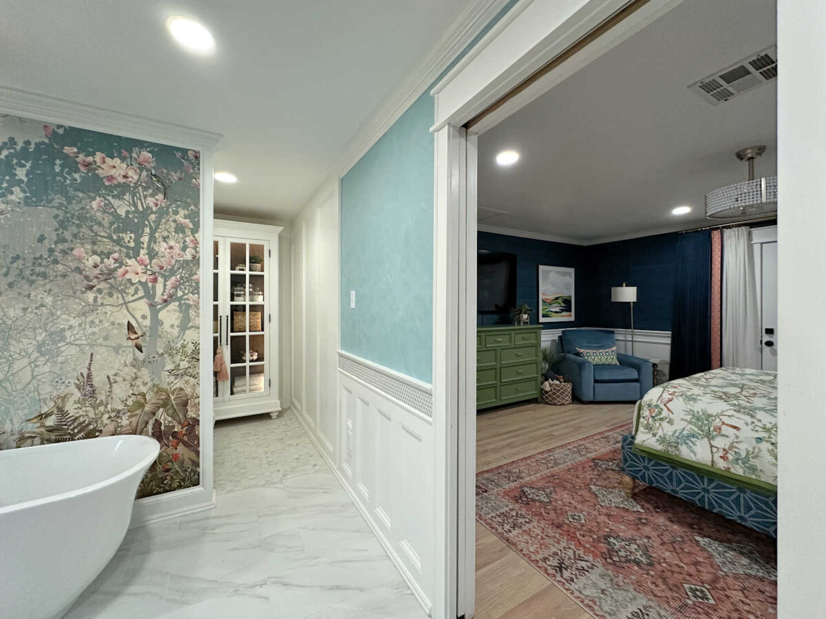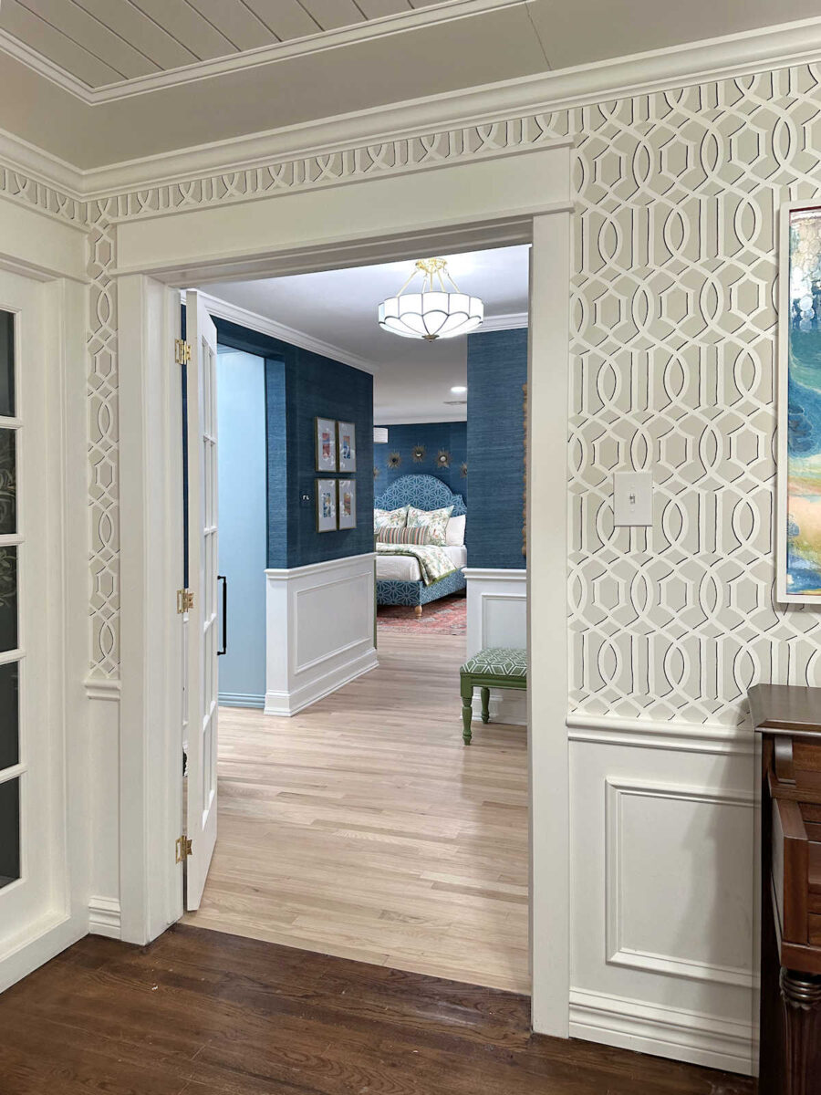 We’ll start at the entrance. This used to be a cased opening into a hallway, and in that hallway, there were four doorways — three doorways to three bedrooms, and one doorway to a guest bathroom. Now the cased opening has French doors, and the whole area is our master bedroom suite. I love that when I stand in the music room, I can not only see the foyer, but I can also get a glimpse into the colorful closet and our new inviting bedroom.