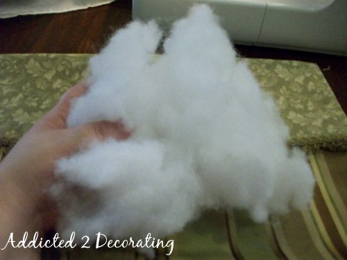 Now stuff your pillow. Take a handful of polyester filling, use your hands to fluff it up, and then stuff it into the pillow. Again, pay special attention to the corners. I can’t stand a pillow with empty deflated corners!!