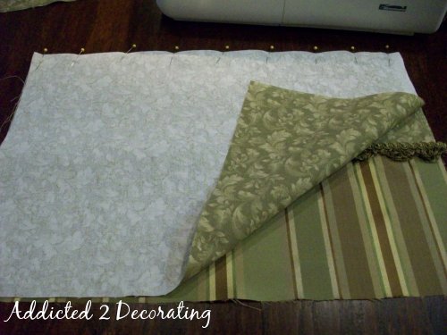 To make this 18″ x 12″ pillow, you’ll need two fabrics and your choice of trim. The trim needs to be a flat decorative type. Some trims have a “lip” on them that is meant to be sewn into the seam where the lip won’t be seen on the final product. You’ll recognize this type of trim because the “lip” isn’t very pretty at all. So select a trim that is meant to lie flat and is completely decorative. Got it?