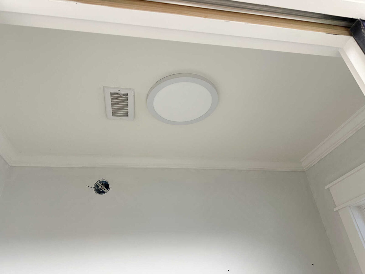 I like that it’s white, so it won’t stand out too much from the ceiling and demand too much attention. But it also adds a bit of interest and texture to the ceiling. It’ll be an upgrade from the plain utilitarian light that’s in there right now. And with that, I think I have all of the main elements I need to finish up this bathroom.
