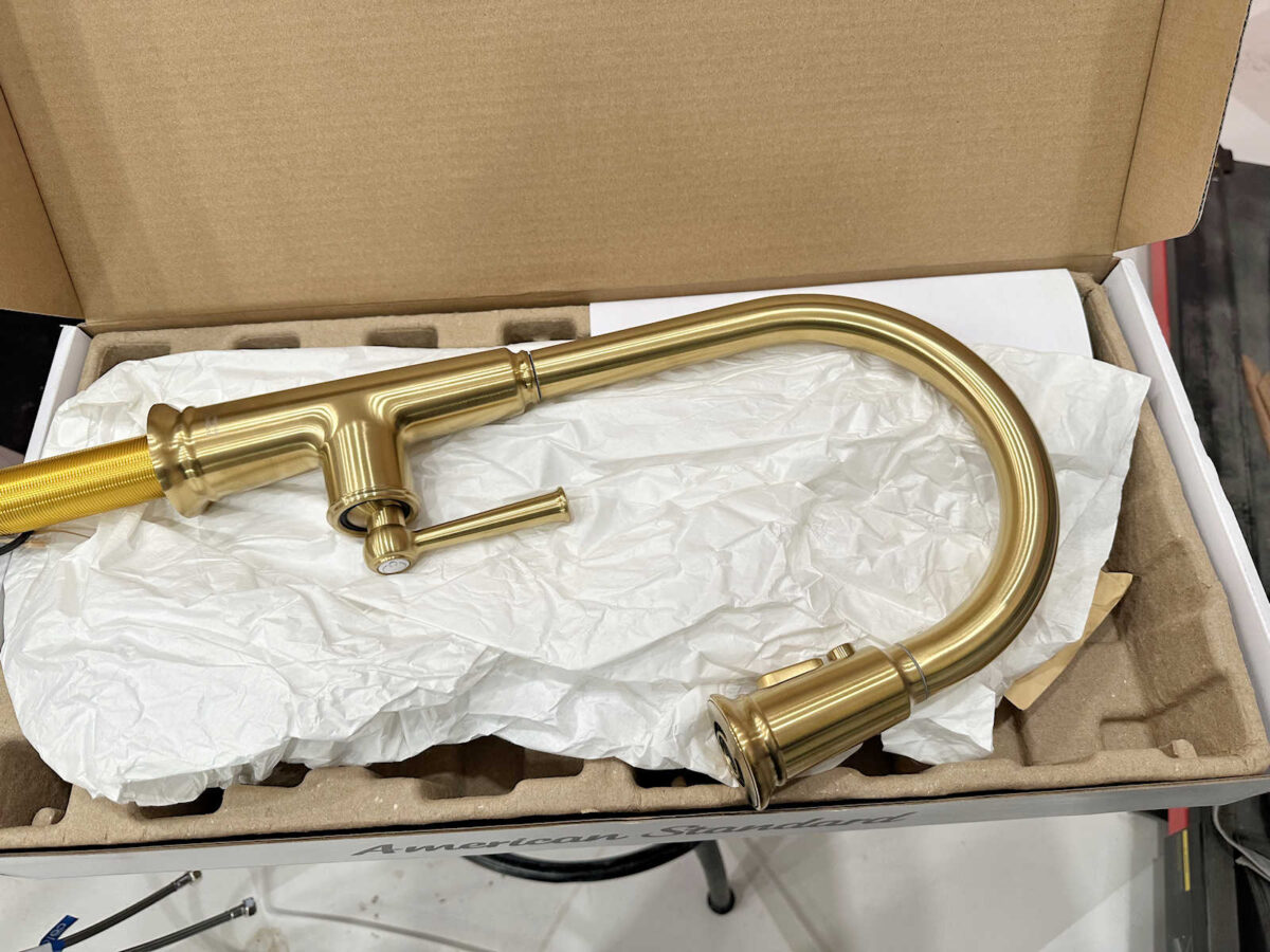 I also bought a new faucet for the sink. I picked up this American Standard Highgrove faucet in a brushed gold. I’m anxious to get it installed, but I’m going to wait unit all of the trim is finished because it’s difficult working around a large faucet. I don’t want to take a chance on it getting scratched.