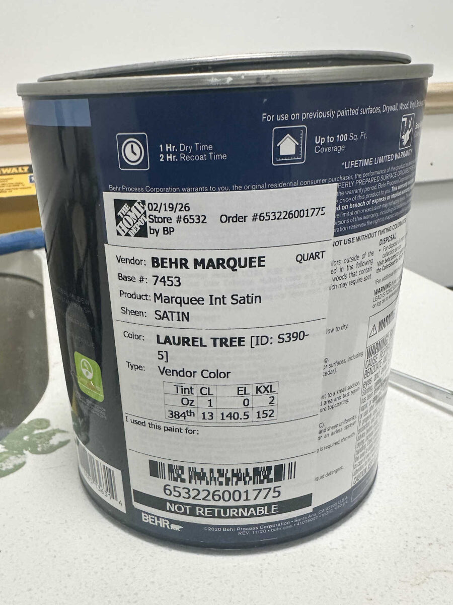 I’m going to stick with this color, though. It’s a Behr color called Laurel Tree, and I was actually shocked at how close it was to the green on the walls.