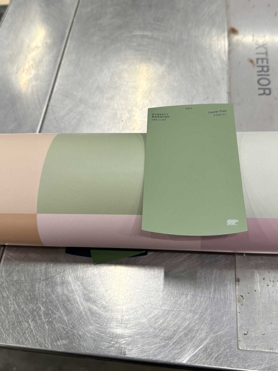 Laurel Tree by Behr is pretty close to the walls, but it is just a little darker than the walls. Here’s Laurel Tree compared to that same green in the wallpaper.