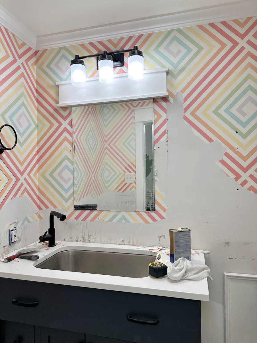 But I can’t even imagine using tiles with this wallpaper. I don’t think there’s any kind of tile that would look good with this wallpaper covered in squares.