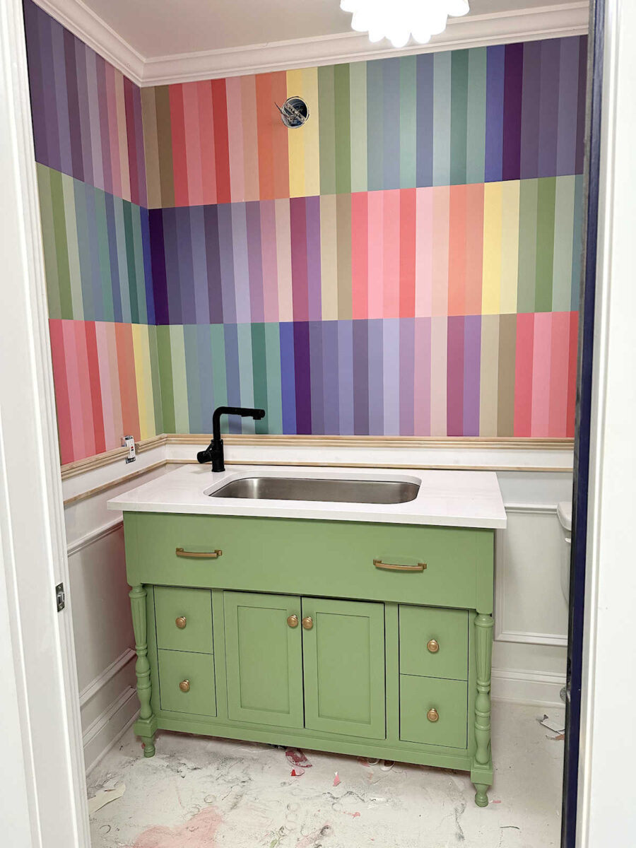 So using the right green really made a huge difference. And in the end, I think green was the right choice for me. I kept going back to a comment from one person who said a green vanity would make the room look like a garden, and the colorful stripes are like the flowers in the garden. That’s the comment that sealed the deal and made me stick with the green.