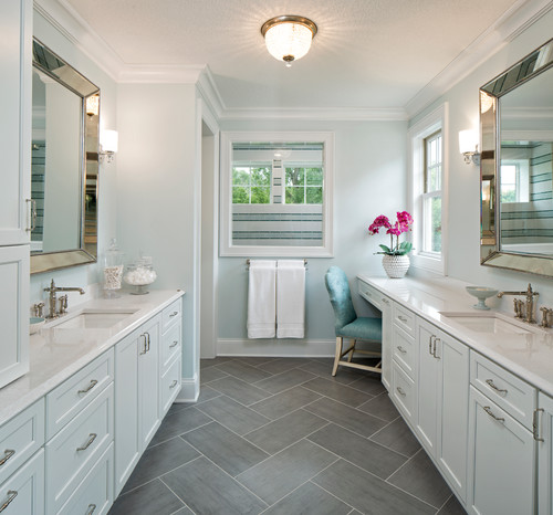 But even with all of its wonderful qualities, I think I’m going to steer away from vinyl tile this time. Right now, I’m leaning towards real tile (ceramic or porcelain) mainly because of the durability. And my plan right now is to find a medium to light gray or gray/white combo a 12 x 24 size installed in a herringbone pattern.
