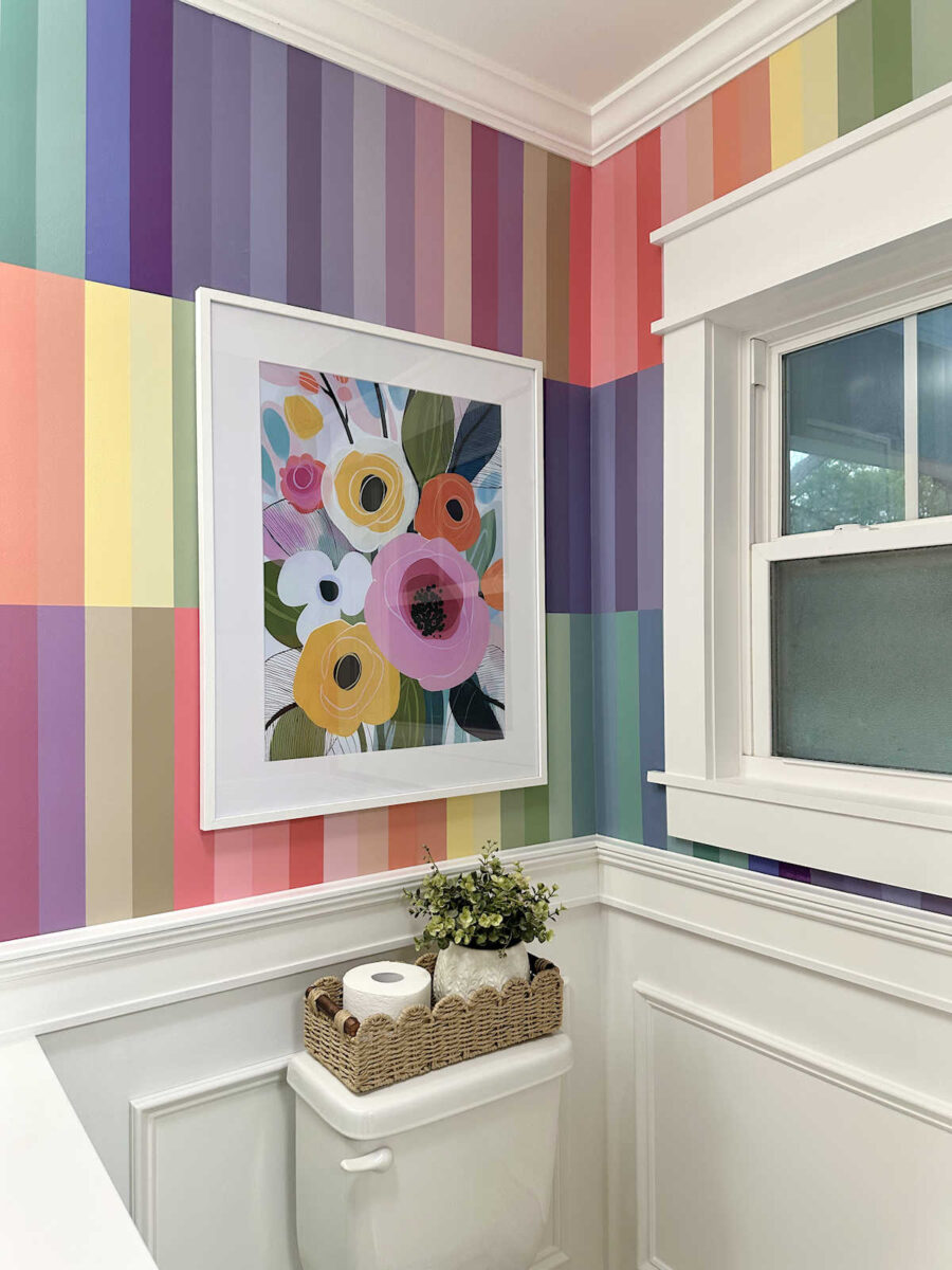 And while I love, love, LOVE the walls, I did feel like I needed something to break up all of the color and stripes, so I found this colorful floral downloadable artwork, had it printed, and then put it in a white frame with a large white mat. I think it’s a nice “break” in the wall design without hiding too much of the walls.