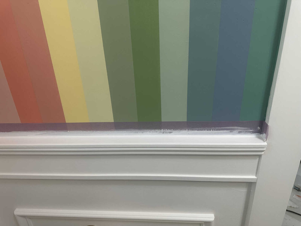 I removed the tape while the second coat of paint was still wet, and it left this perfectly straight and crisp caulk/paint line between the wainscoting and striped wall.