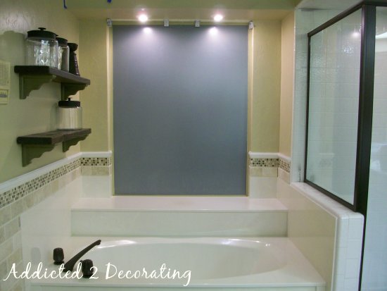 If you know what to look for, then you can barely make out the shelves on the wall, and you can kind of see the shape of the ladder. But if you didn’t already know what those items were, I don’t think there’s any way you could guess. I love that!! And again, that’s with it completely dark outside, and all of the lights turned on inside the bathroom.